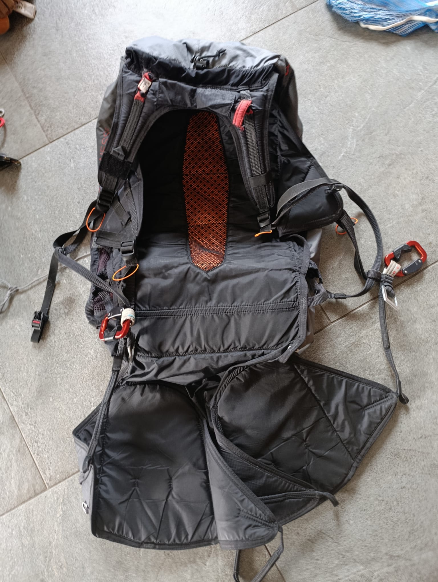 Système Advance Easiness 2 : sans airbag et les fixations du parachute de secours sont cassées. Pourrait convenir comme harnais de vol après vérification. Utilisable uniquement avec un parachute de secours monté à l’avant.