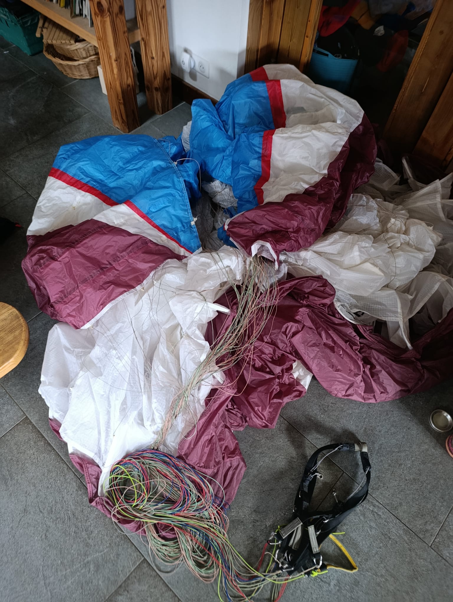 Valise : 85 à 105 kg, très peu utilisée (moins de 10 heures), encore en bon état. Quelques petites réparations sont nécessaires. Deux des suspentes supérieures présentent de petits trous dans le tissu, réparables avec un patch adhésif. Voir photos. J’ai effectué un gonflage rapide et c’était parfait !