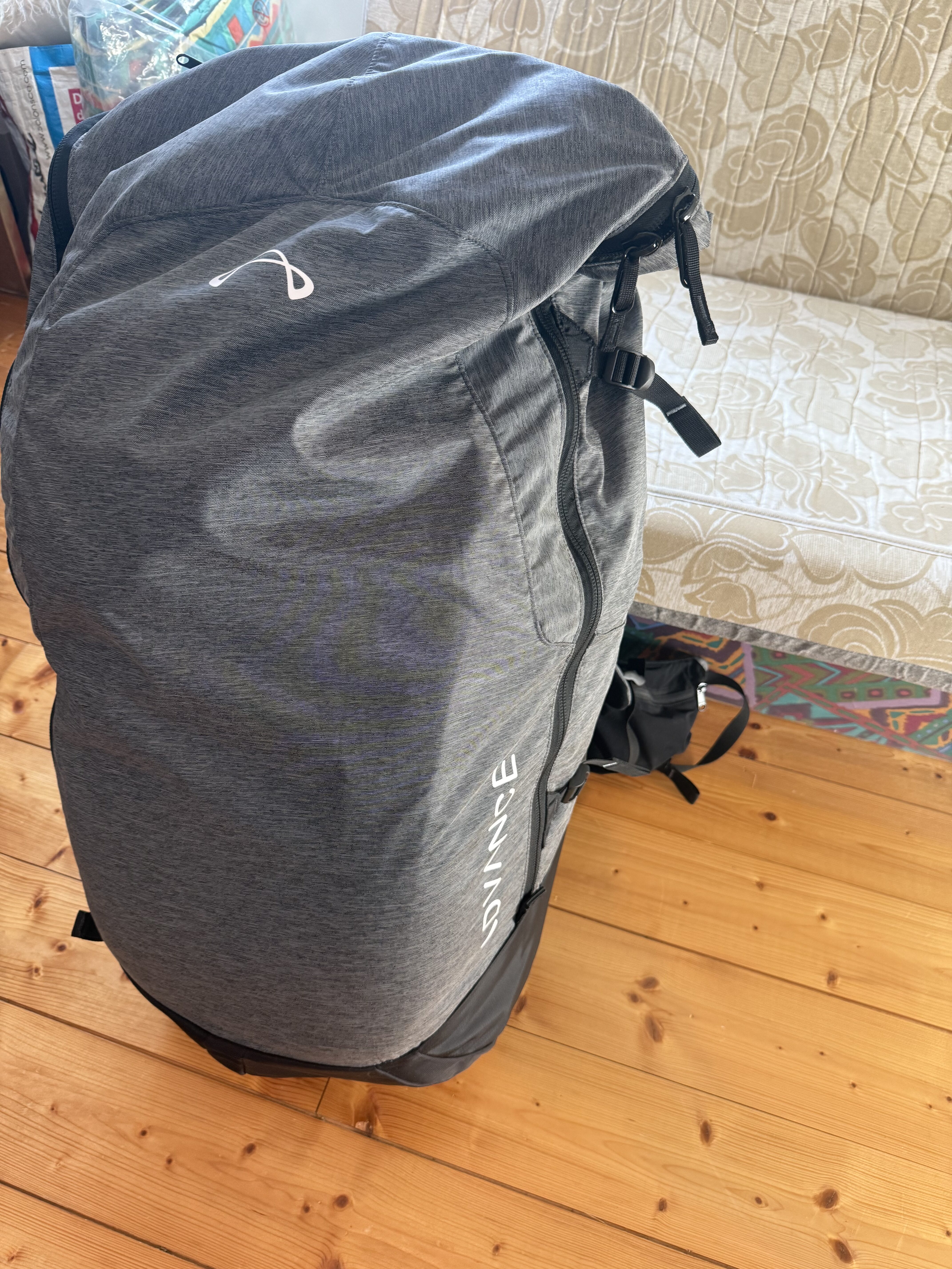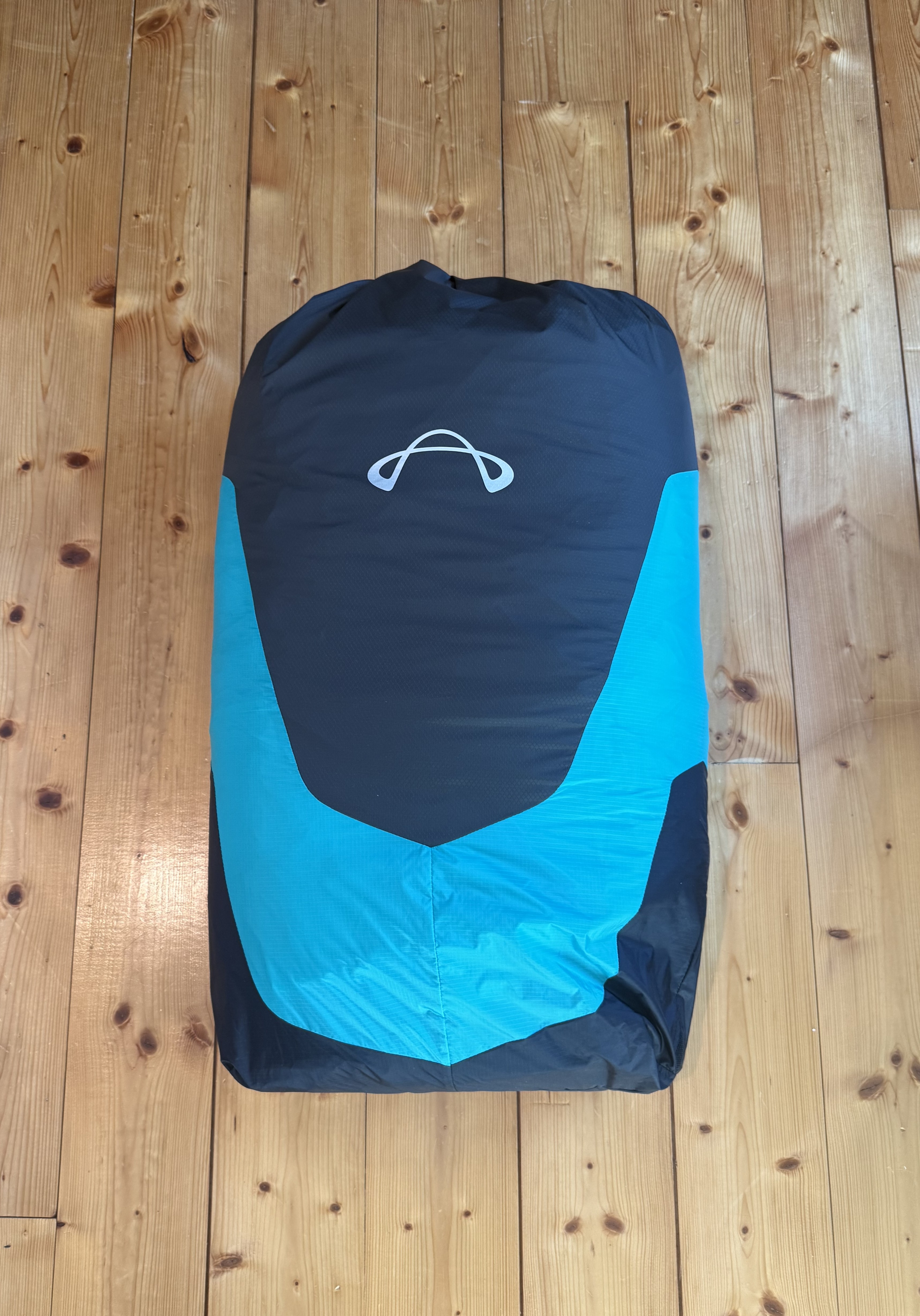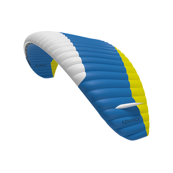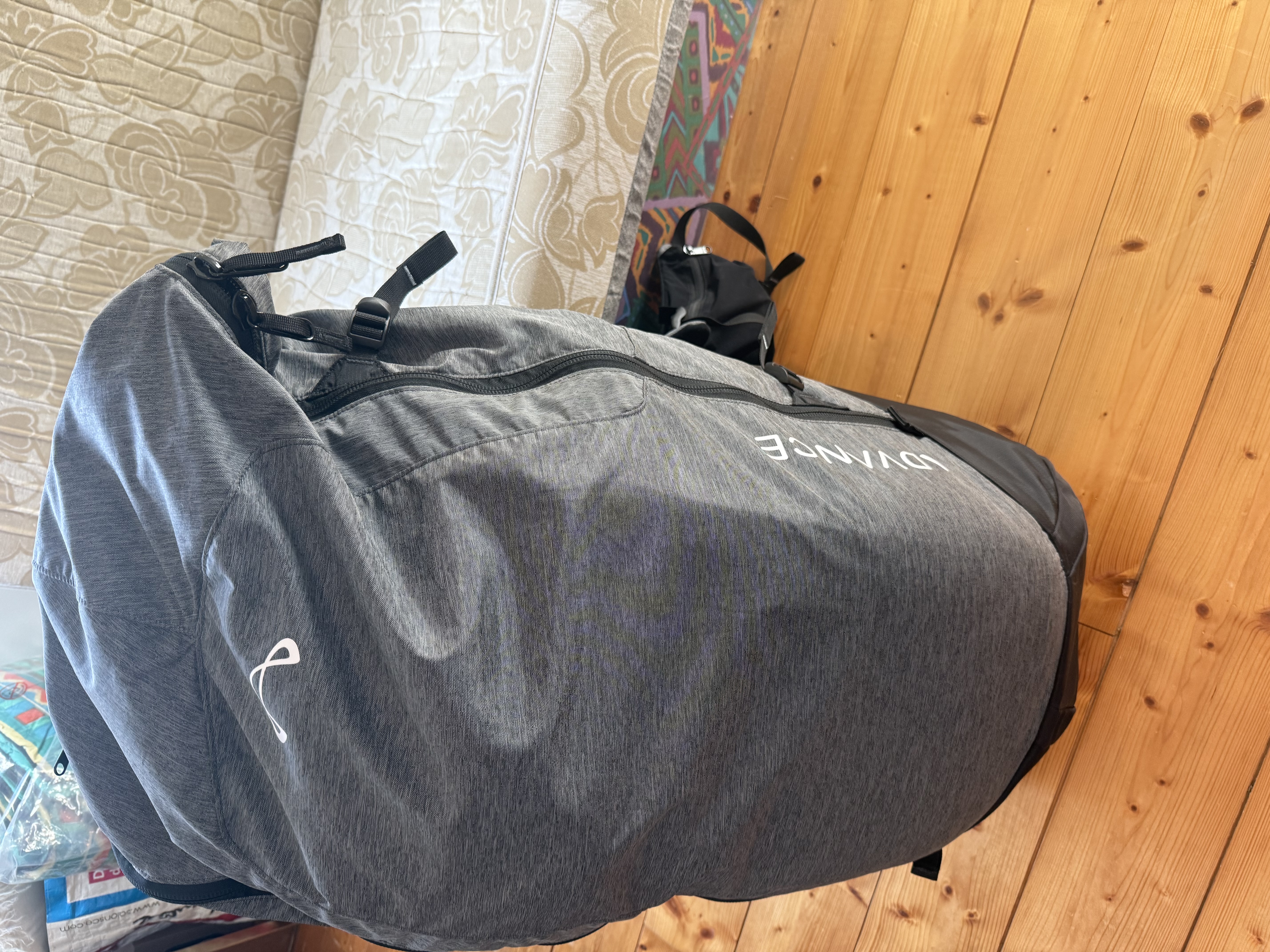 Voile Advance Alpha 7 (28m2) couleur bleu/blanc/jaune, achetée d’occasion fin 2023 chez Aerogliss à la suite d’un stage. Pas de vols depuis. Pliage soignée dans son compressbag