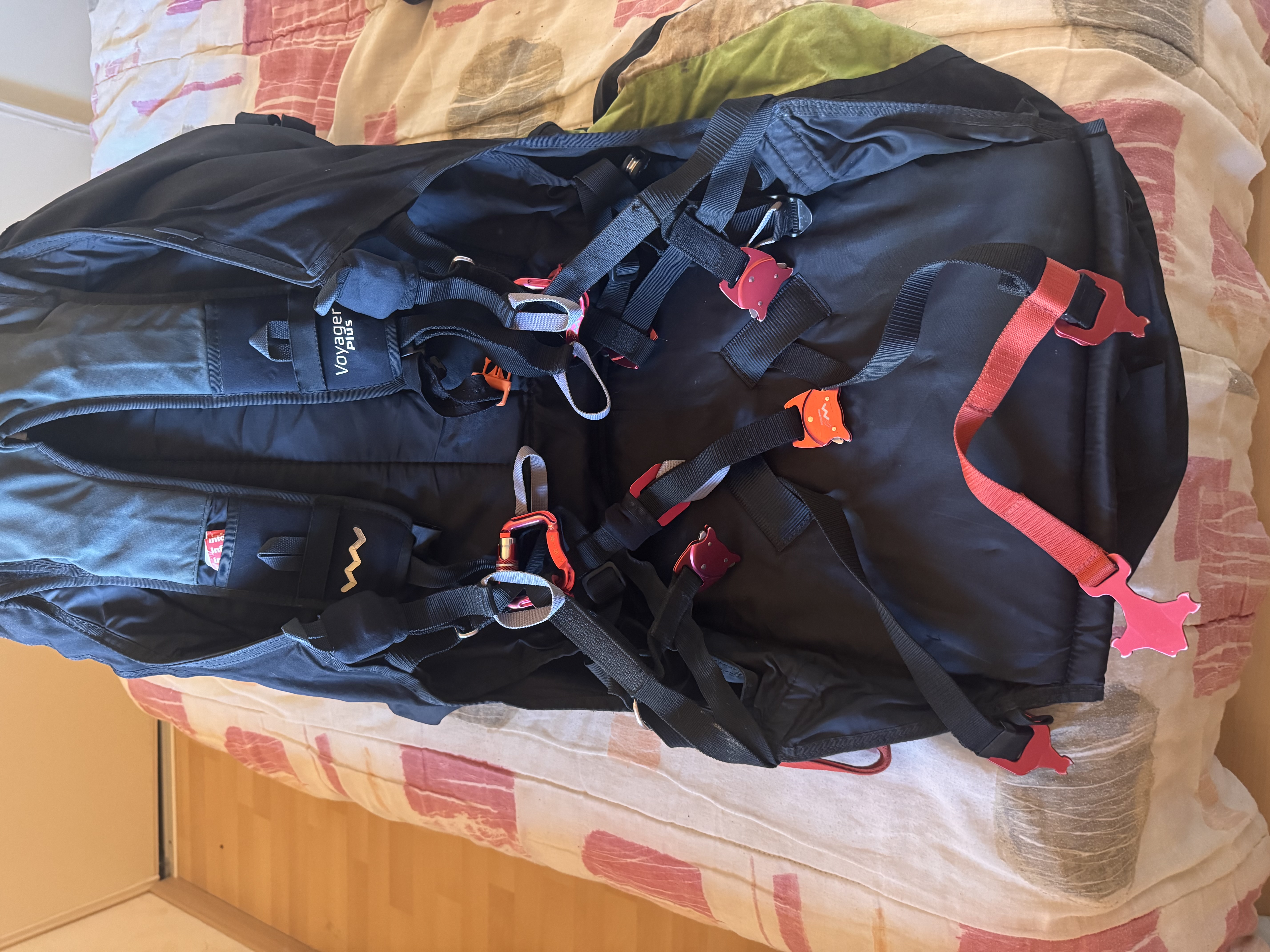 Sellette rando-vol avec airbag sous-cutale et secours sous-cutale.