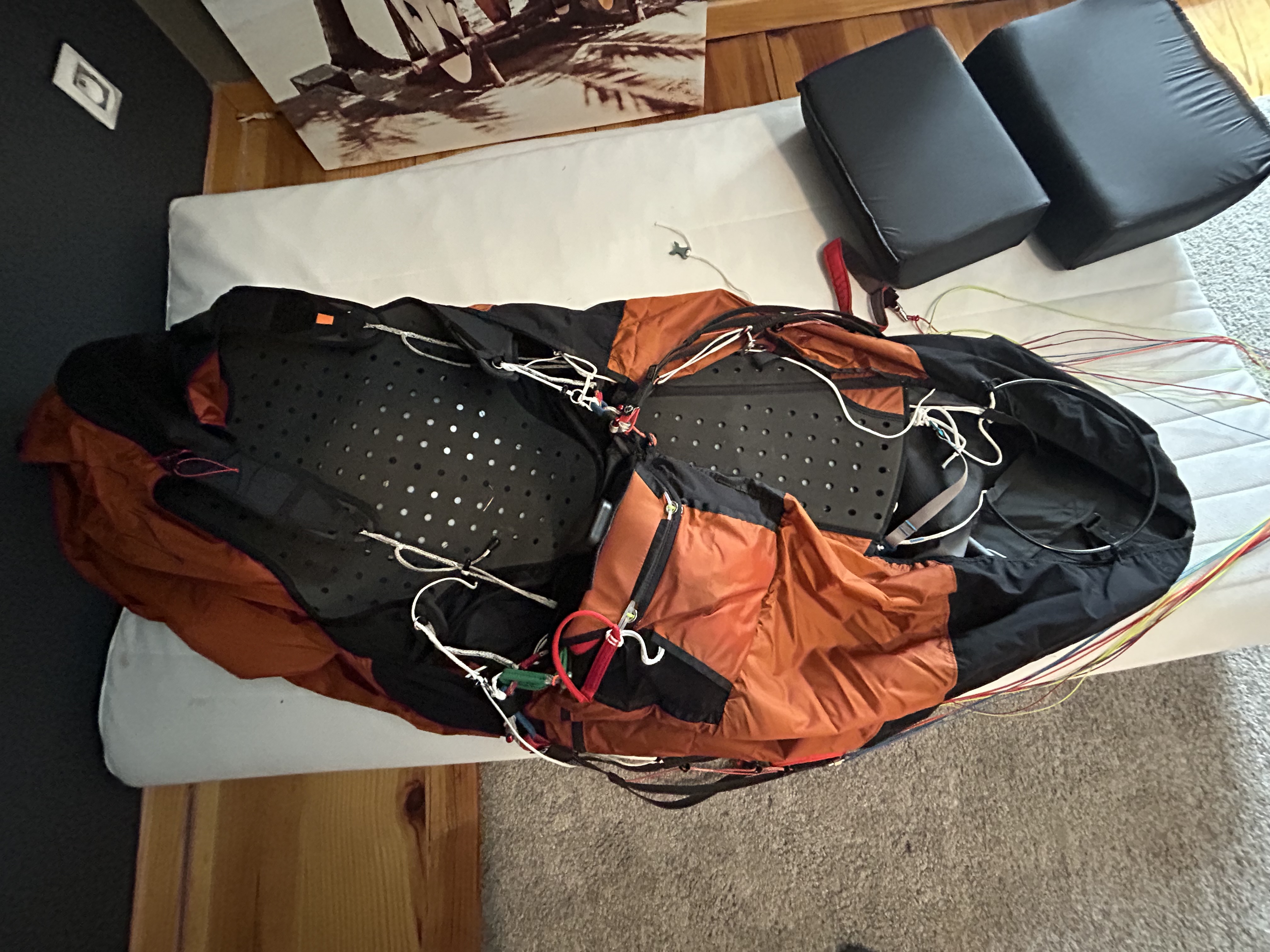 Je vends cette sellette que j’ai utilisé cinq ou six fois elle est neuve taille M. Son poids avec les mousse, Bag, 1,90 kg.