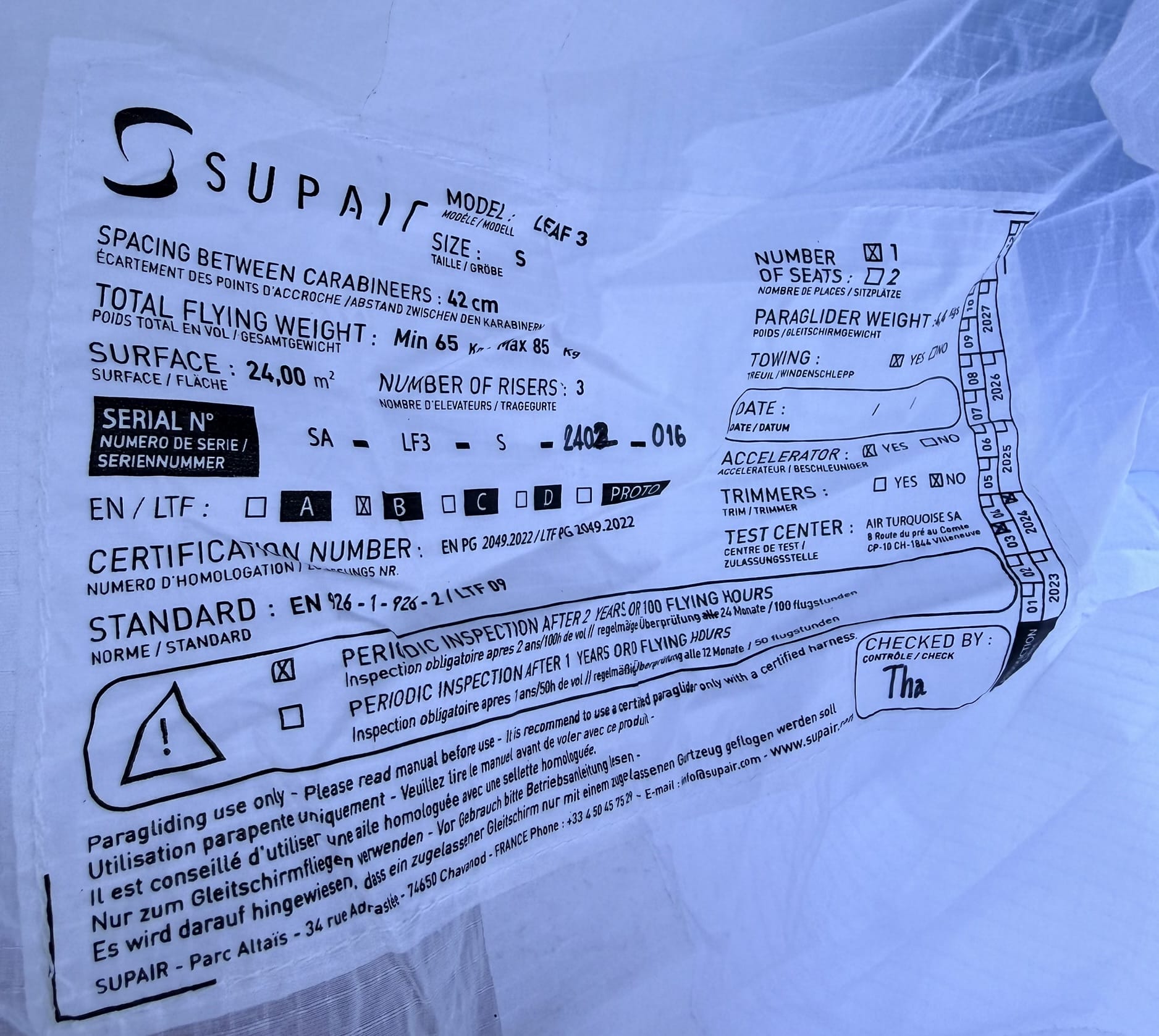 Année de construction : 2024. Environ 10 heures de vol dans des conditions sèches, décollages et atterrissages sur prairie/neige. Acheté neuf le 20 juillet 2024 en raison de ses caractéristiques : rapport latéral élevé et sécurité maximale (En-B). Vente due à l’abandon du parapente. Très bonnes sensations de vol et grande sécurité. Sac de rangement pratique. Supair Leaf 3 : Surface 24 m^2 Taille S 4,4 kg Poids au décollage : 65-85 kg https://supair.com/produit/aile-parapente-supair-en-b-leaf3/ Peut également être récupéré à Lucerne/Suisse. Téléphone : +41 782614912